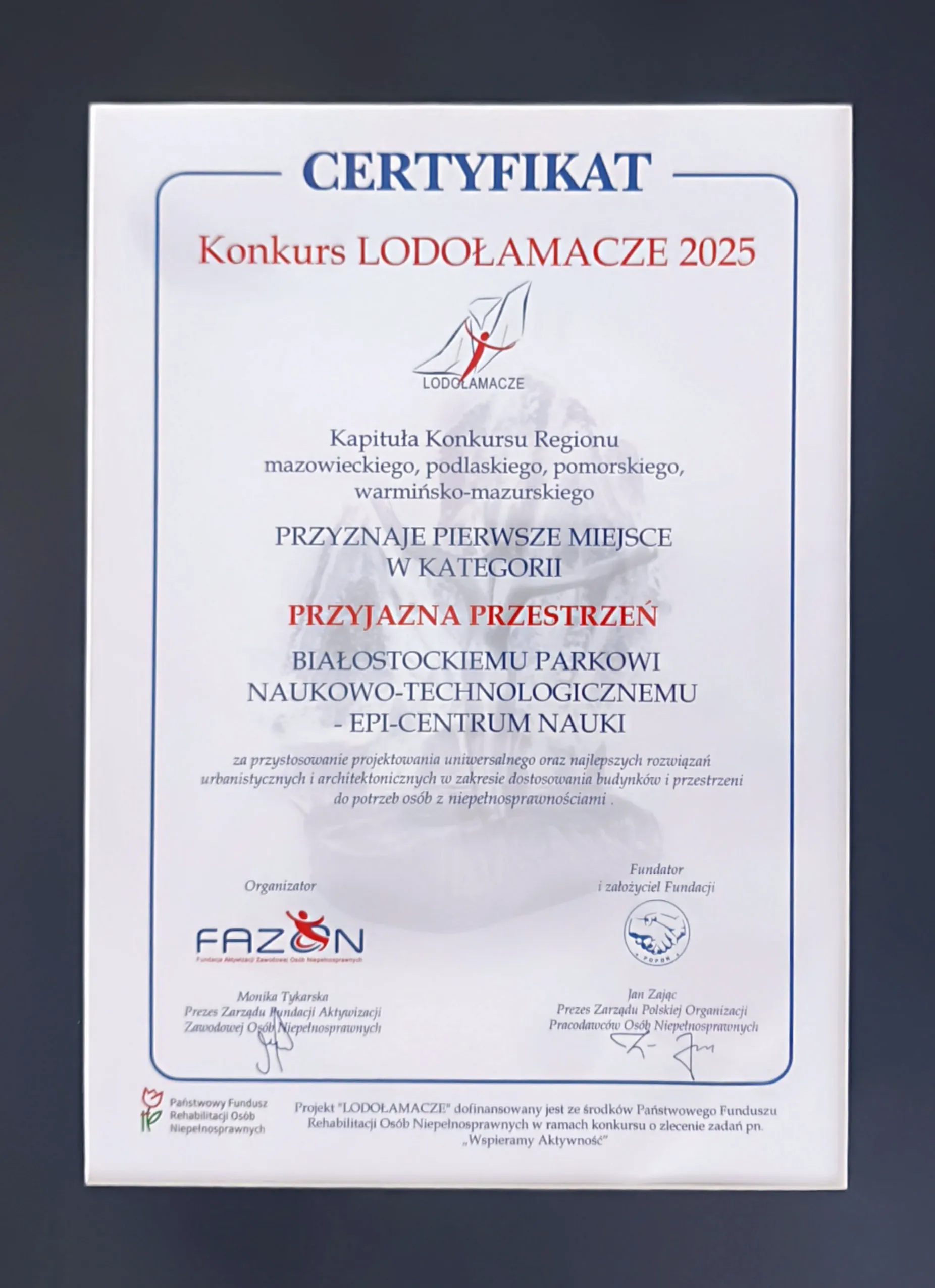 16 września w Polskiej Filharmonii Bałtyckiej w Gdańsku, podczas regionalnej gali jubileuszowej XX edycji konkursu „Łodołamacze”, Epi-Centrum Nauki w Białymstoku otrzymało statuetkę za I miejsce w kategorii „Przyjazna Przestrzeń”.